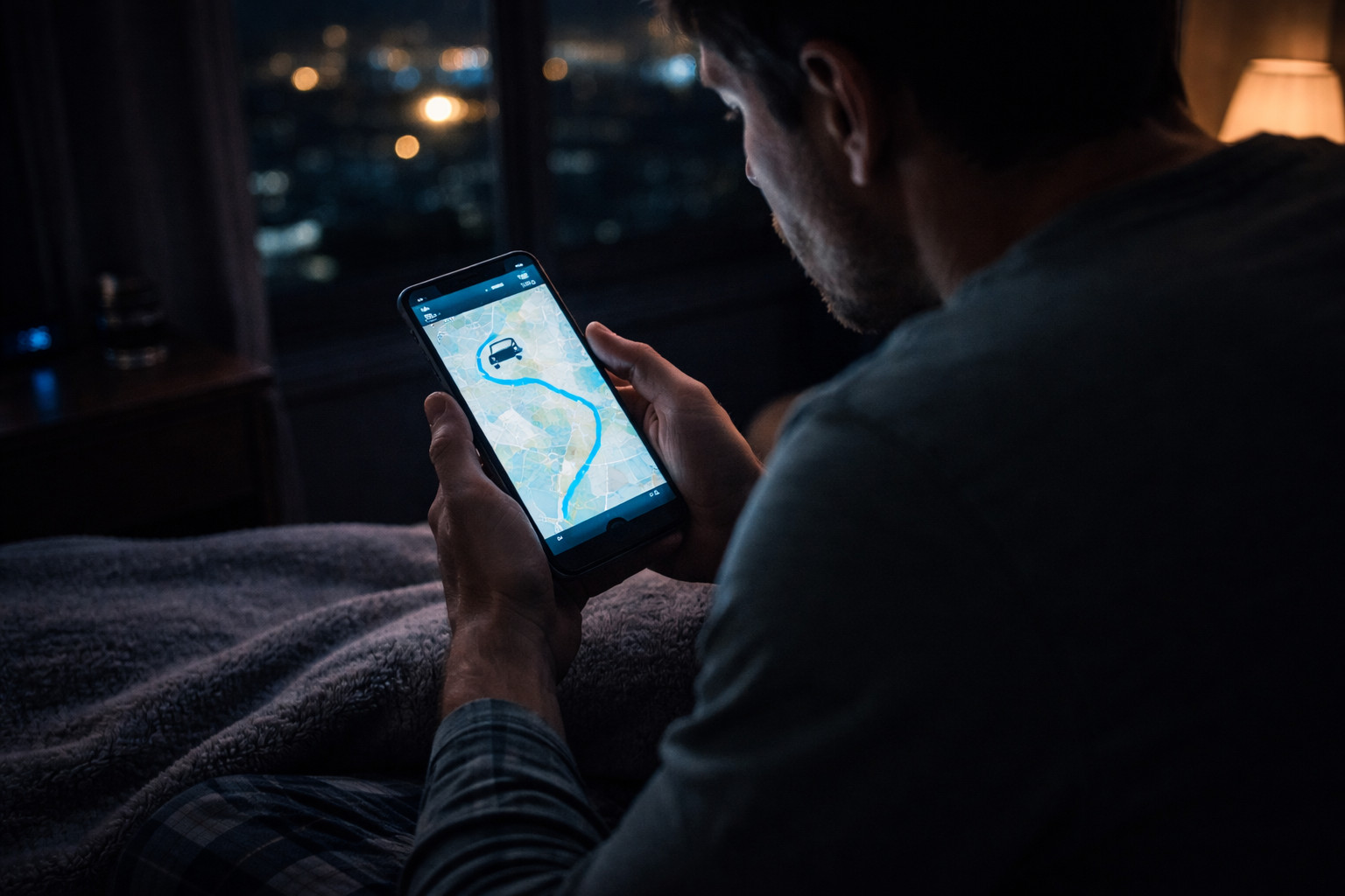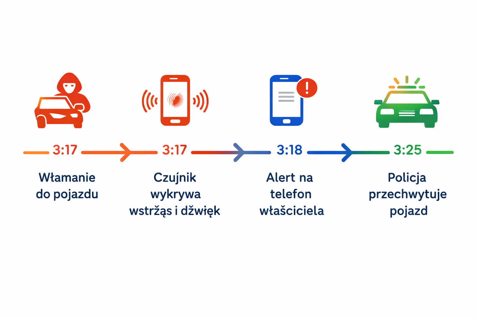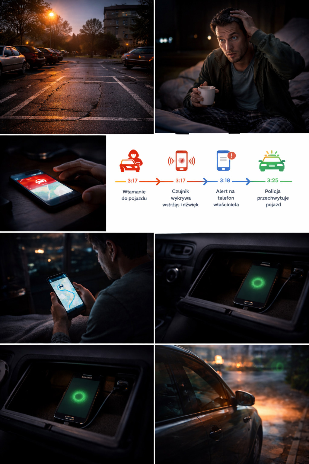Tomek budzi się od wibracji telefonu. Widzi alert. Otwiera aplikację i na mapie śledzi swoje auto w czasie rzeczywistym. Samochód właśnie wyjechał z parkingu i jedzie ulicą Puławską w kierunku centrum. Tomek natychmiast dzwoni na 112. Podaje dokładną lokalizację pojazdu — ulica, numer, kierunek jazdy. Aktualizuje dyżurnego co kilkanaście sekund. Patrol przechwytuje auto po ośmiu minutach na Moście Poniatowskiego.
