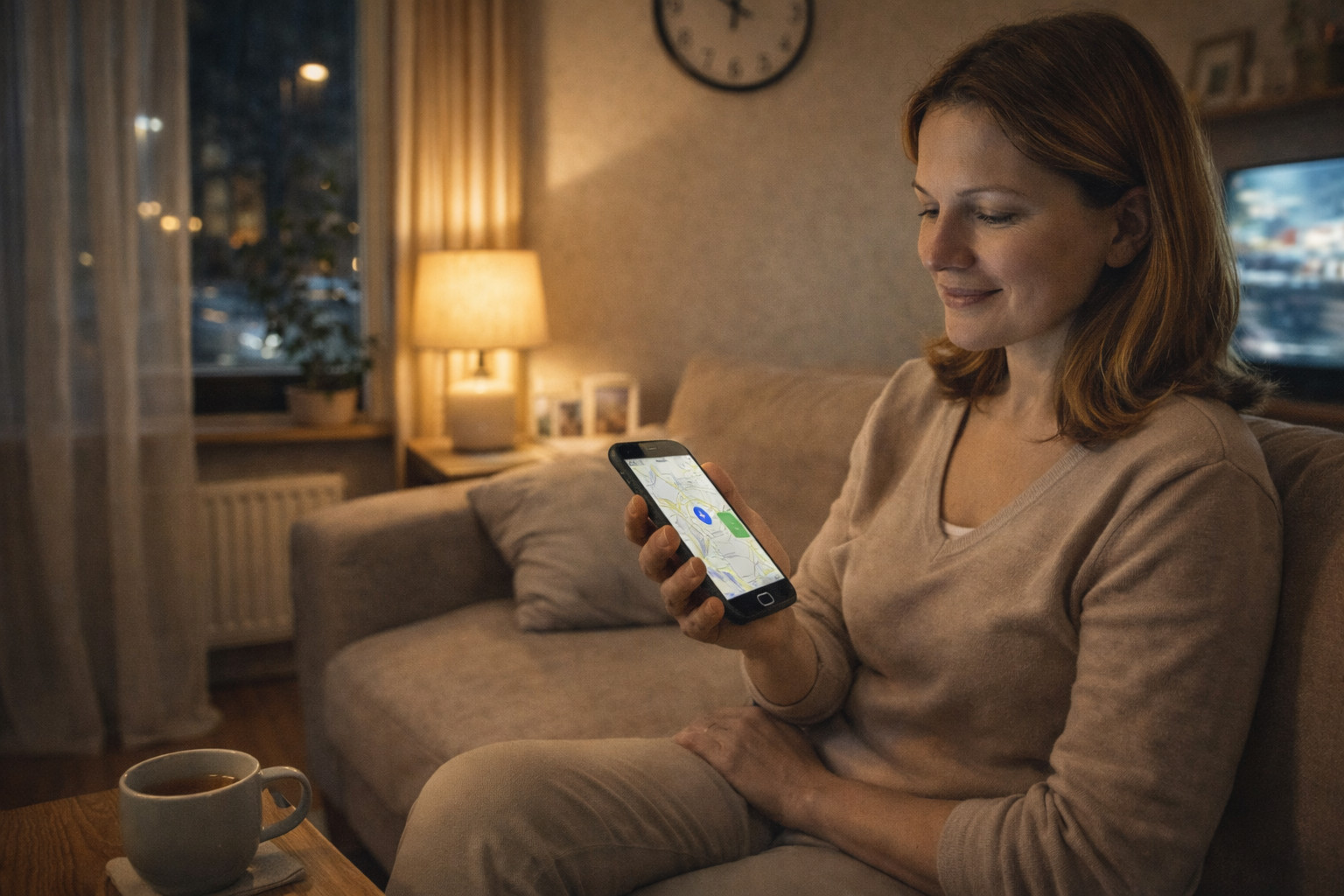 Piątek wieczorem. Kajetan jedzie do Legionowa. Magda widzi na mapie, że auto wyjechało poza zwykłą trasę szkoła–dom–trening. Widzi, że jedzie ekspresówką. Nie dzwoni od razu — daje mu przestrzeń. Ale o 21:30, gdy Kajetan powinien być w domu, a mapa pokazuje, że auto stoi na parkingu w Legionowie, Magda wysyła spokojnego SMS-a: „Widzę, że jesteś w Legionowie. Wszystko OK?" Kajtek odpowiada: „Tak, gramy mecz. Będę o 23."