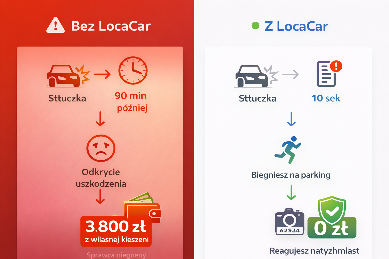 Z danych Ubezpieczeniowego Funduszu Gwarancyjnego wynika, że co roku w Polsce dochodzi do dziesiątek tysięcy kolizji parkingowych, z których sprawca odjeżdża z miejsca zdarzenia. Większość tych spraw jest umarzana. LocaCar nie wyeliminuje niecnych kierowców z parkingów, ale sprawi, że masz realną szansę na złapanie sprawcy — bo dostaniesz powiadomienie, zanim ten zdąży zniknąć.